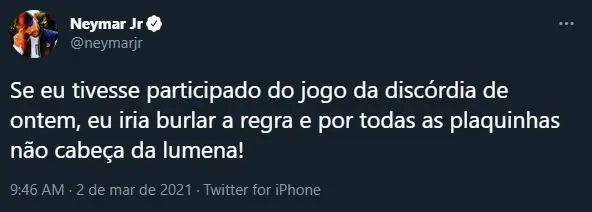 Neymar critica Lumena e cita Jogo da Discórdia do BBB 21: 'todas as plaquinhas na cabeça dela'