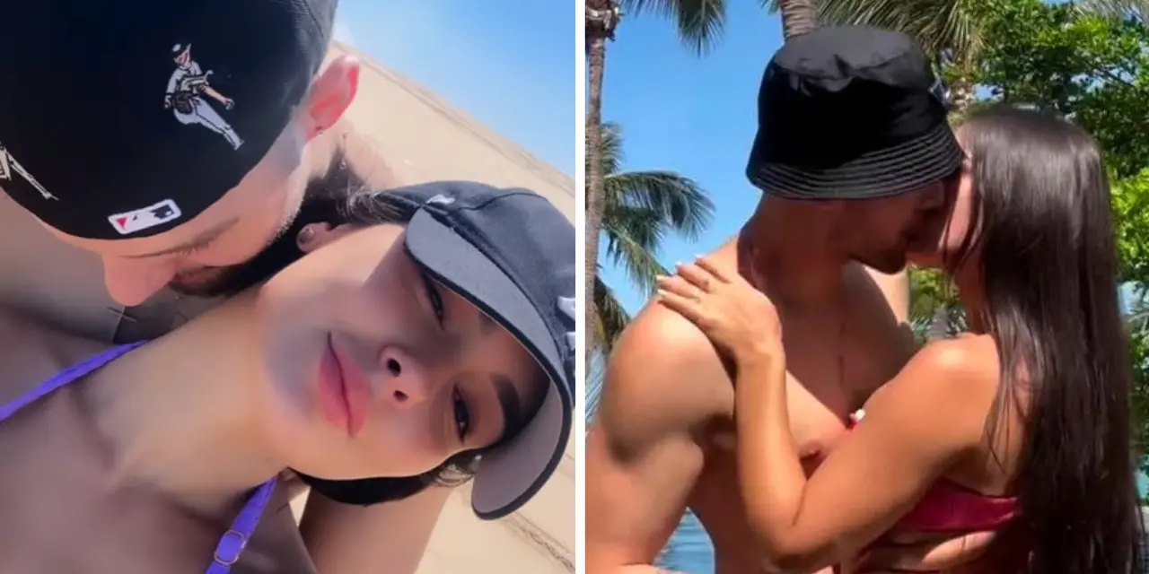Larissa exibiu os anéis de compromisso que os dois usam e um buquê de rosas que recebeu do amado. A publicação também tem outros momentos do casal na viagem pelo litoral cearense.