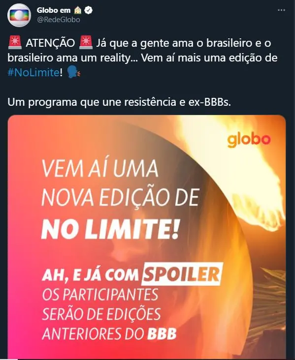 "Atenção! Já que a gente ama o brasileiro e o brasileiro ama um reality... Vem aí mais uma edição de No Limite! Um programa que une resistência e ex-BBB's", declarou a publicação.