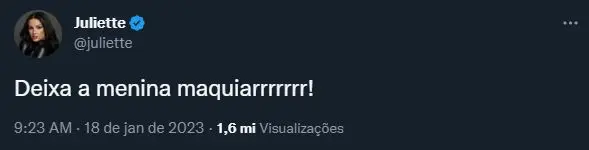 "Deixa a menina maquiar!", escreveu Juliette na manhã desta quarta (18), mostrando que tem acompanhado o reality até então. O tuíte teve quase 40 mil curtidas e os seguidores da cantora brincaram com a situação. Em casas de aposta, por exemplo, ela figura como a favorita a levar o prêmio de R$ 1,5 milhão.