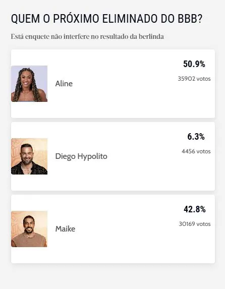 O resultado parcial da enquete do Diário do Nordeste sobre o paredão do Big Brother Brasil desta terça-feira (25) aponta Aline como a próxima eliminada do programa, com 50,9% dos votos.