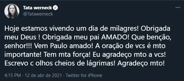 "Hoje é dia de Vitória! Hoje é dia de cura! Para o Paulo Gustavo. Para todos que precisam. Senhor, meu amor pelo senhor é tremendo! É inabalável!", escreveu a atriz. Entretanto, o estado do ator segue definido como grave.
