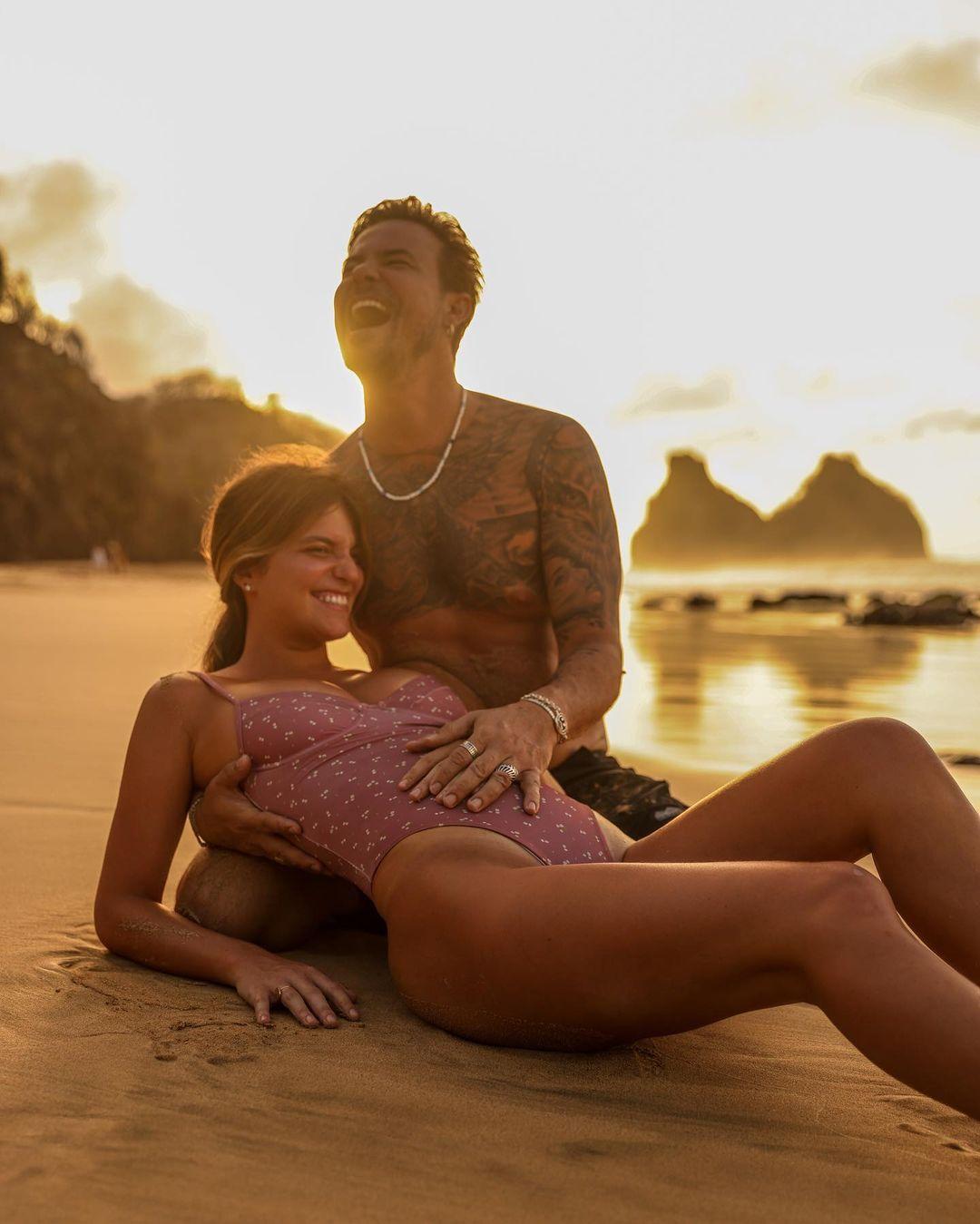 A postagem mostra fotos de um ensaio do casal em Fernando de Noronha. Em uma das imagens, o ator beija a barriga da noiva.