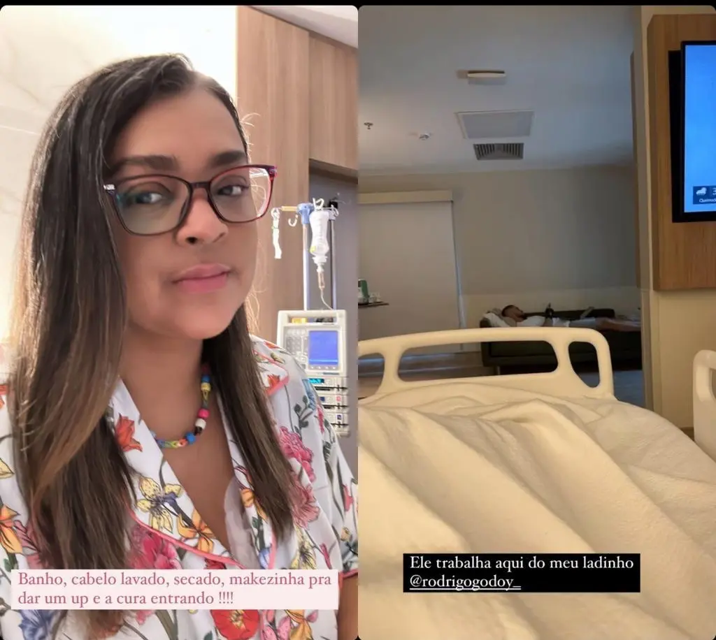 A artista mostrou ainda que o marido, Rodrigo Godoy, a acompanha no hospital, assim como a amiga Soraya Rocha. “Ele trabalha aqui do meu ladinho”, escreveu Preta sobre o marido.