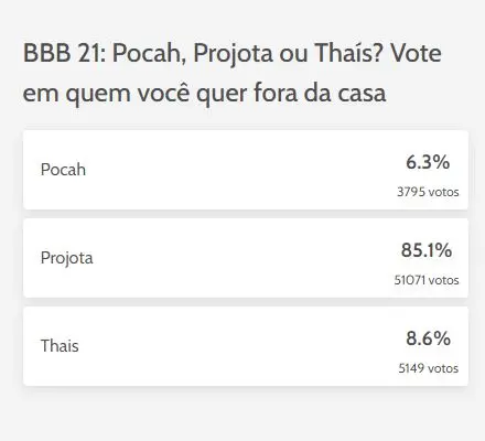 Ao todo, a pesquisa da semana recebeu mais de 60 mil votos dos leitores do site. No entanto, vale lembrar, o resultado apresentado não influencia na eliminação comandada por Tiago Leifert no programa.