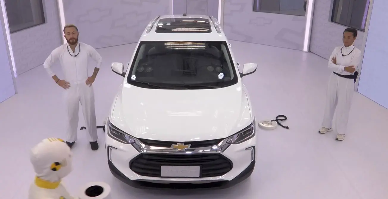 Os dois logo entraram no cômodo, que tem um carro branco dentro. Após isso, ouviram de Tadeu Schmidt as regras para participar do momento.