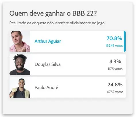 A enquete atualizada do Diário do Nordeste, até o fim da tarde desta terça-feira (26), aponta que o ator Arthur Aguiar será o campeão da 22ª edição do Big Brother Brasil 22. Disputando o prêmio de R$ 1,5 milhão com Douglas Silva e Paulo André, ele teve 70,8% dos votos registrados na pesquisa.