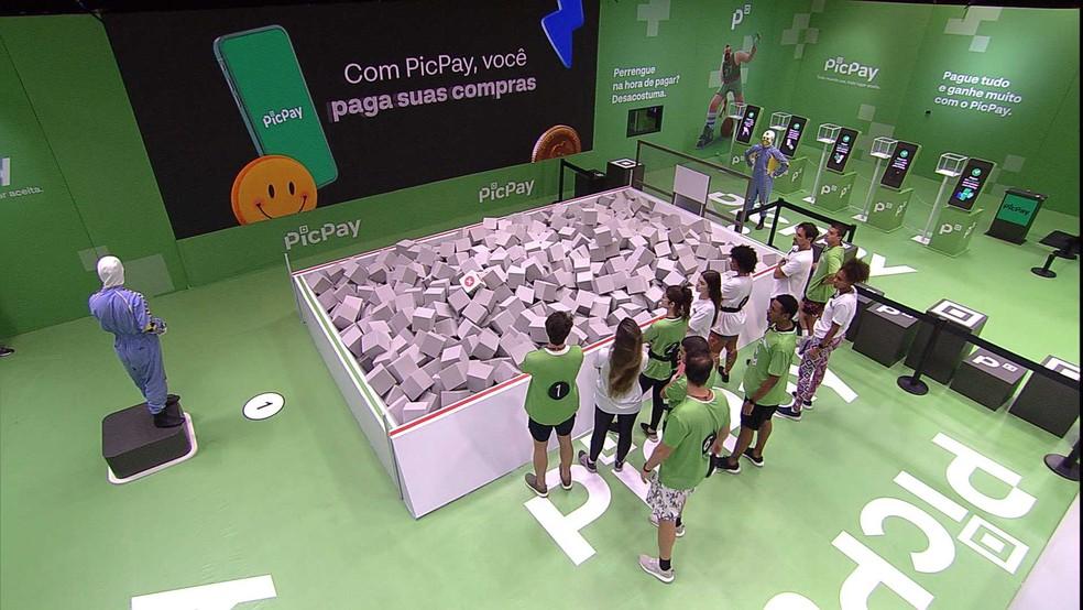 O apresentador, Tadeu Schmidt, explicou como é a dinâmica da prova. "Um jogador sem PicPay (com a camisa branca) vai para a piscina de perrengues procurar cinco cubos com frases de perrengues escritas em cada um deles. O outro jogador (de camisa verde) deverá pegar o cubo e colocá-lo na caixinha junto ao celular que traz a solução correspondente.