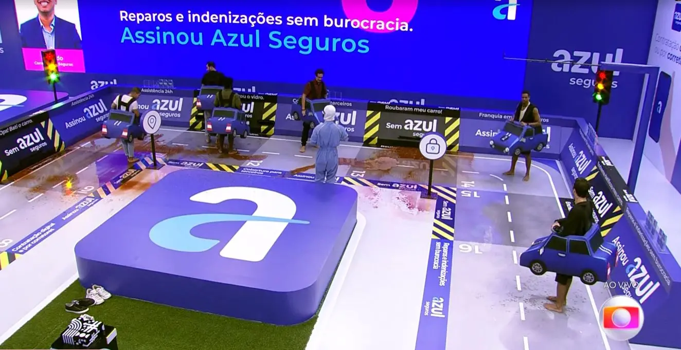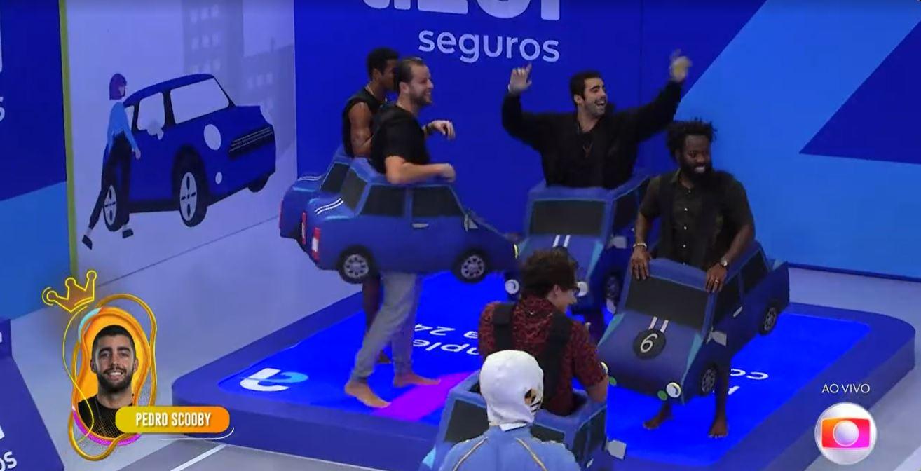 A prova teve o patrocínio de uma empresa de seguro e contará com a sorte dos participantes durante as partidas. Vestidos de carrinhos, os brothers brincam um jogo de tabuleiro.