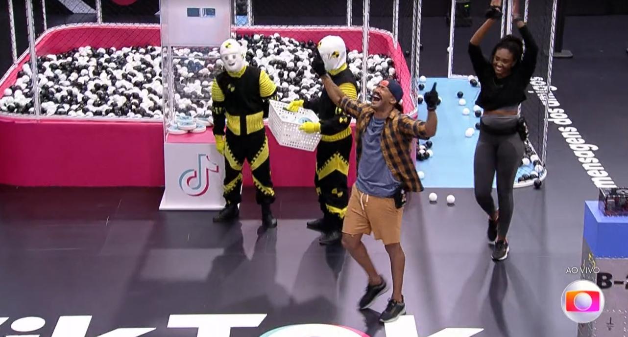 Já na fase final, cada um por si, na piscina de bolinhas para pegar cards dentro. Vence a prova quem somar o maior número de pontos.