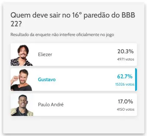 O ex-participante da Casa de Vidro disputa contra Eliezer do Carmo, e seu aliado Paulo André, o PA. Os brothers registram, respectivamente, 20,3% e 17%.