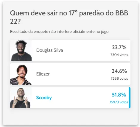 Quem sai do BBB 22? Parcial atualizada da enquete aponta Scooby como eliminado no 17º paredão