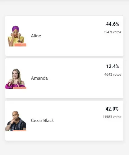 Em seguida, Cezar Black surge com 42,1% dos votos para eliminação, enquanto Amanda tem apenas 13,4% dos votos da enquete. Ao todo, mais de 40 mil votos já foram deixados pelos leitores do Diário do Nordeste.