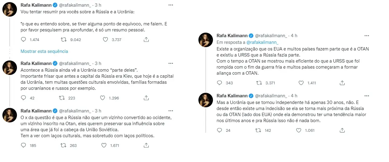 Horas após o presidente russo Vladimir Putin ordenar a invasão da Ucrânia, na manhã de quinta-feira (24), a apresentadora e ex-BBB Rafa Kalimann usou o Twitter para tentar explicar o conflito em andamento no Leste Europeu.
