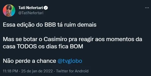 "Essa edição do BBB tá ruim demais. Mas se botar o Casimiro pra reagir aos momentos da casa todos os dias fica bom. Não perde a chance, TV Globo", escreveu uma usuária do Twitter.