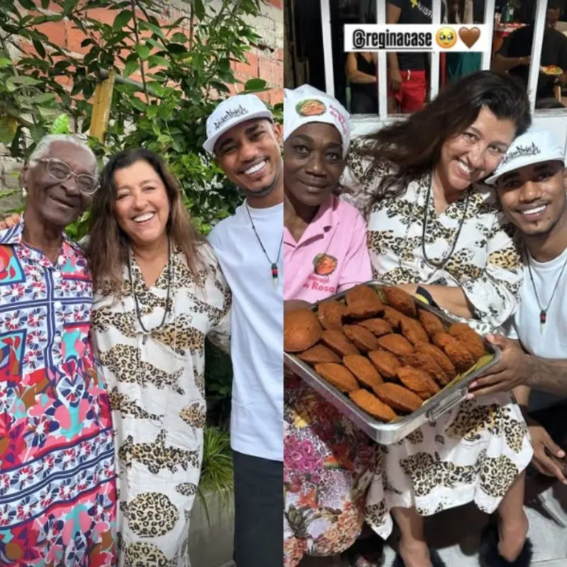 Durante a visita, Regina também provou acarajé preparado pela mãe de Danrlei. Encantada, ela elogiou a culinária e a hospitalidade. "Acarajé ma-ra-vi-lho-so", escreveu. "Dona Jandira, vó de O Kanalha, é uma mina de ouro! A Bahia me entregando tudo que minha alma precisava neste momento", completou a atriz, visivelmente emocionada.