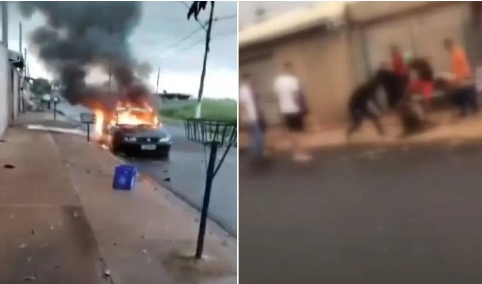 Mulher aparece quebrando os vidros do carro do esposo. Durante a confusão, o próprio pai ateou fogo no veículo e precisou ser contido pela população
