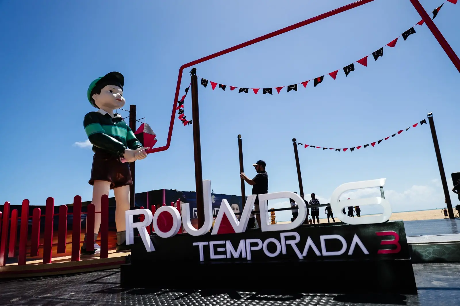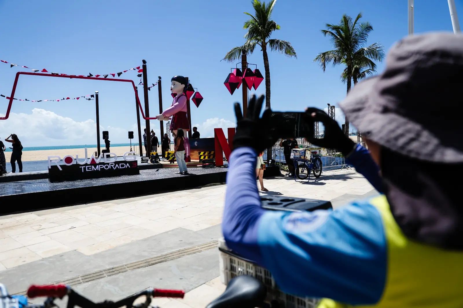 Quem passou pela orla da Beira Mar de Fortaleza, no início da tarde desta sexta-feira (27), foi surpreendido pela presença de dois bonecos gigantes e uma estrutura colorida de pular corda. A Netflix, uma das maiores plataformas de streaming, montou uma estrutura especial na capital cearense para reunir os fãs da série "Round 6", que estreou a 3ª e última temporada também nesta data.