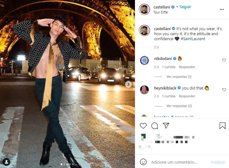 Atualmente, Castellani compartilhou imagens durante presença no desfile da Balmain, na Semana de Moda de Paris, onde se sentou ao lado de estrelas brasileiras como Isis Valverde e Simaria.