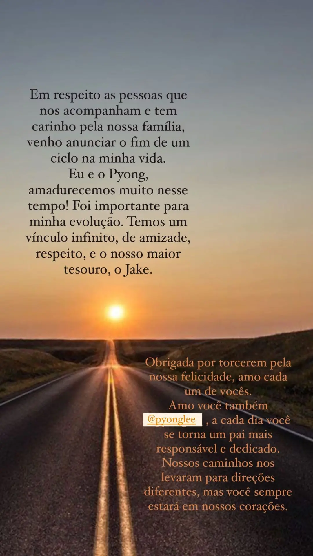 "Em respeito às pessoas que nos acompanham e têm carinho pela nossa família, vim anunciar o fim de um ciclo na minha vida. Eu e o Pyong amadurecemos muito nesse tempo. Foi importante para a minha evolução", disse a influenciadora em publicação em stories do Instagram.