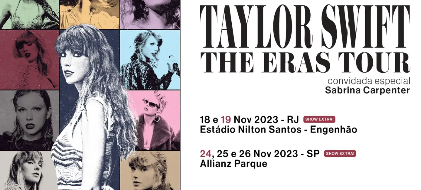 "Taylor Swift | The Eras Tour está chegando ao Rio de Janeiro por DUAS noites, dia 18 de novembro e um SHOW EXTRA dia 19 de novembro, e São Paulo por TRÊS noites, dias 25 e 26 de novembro e um SHOW EXTRA dia 24 de novembro, todos com Sabrina Carpenter como convidada especial!", confirmou a produtora brasileira TF4, responsável pelo evento.