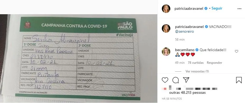 Além de Rebeca, Patrícia Abravanel, outra filha de Silvio, também resolveu divulgar o marco na vida do pai. No Instagram, ela mostrou aos seguidores que a vacina aplicada foi a CoronaVac, desenvolvida em parceria entre o Instituto Butantan e o laboratório chinês Sinovac.