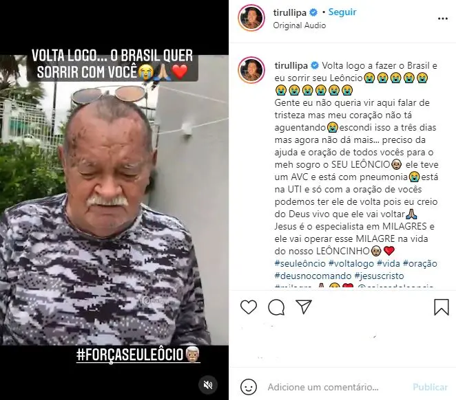 "Preciso da ajuda e oração de todos vocês para o meu sogro o SEU LEÔNCIO. Ele teve um AVC e está com pneumonia. Está na UTI e só com a oração de vocês podemos ter ele de volta, pois eu creio no Deus vivo que ele vai voltar. Jesus é o especialista em MILAGRES e ele vai operar esse MILAGRE na vida do nosso LEÔNCINHO", escreveu o artista.