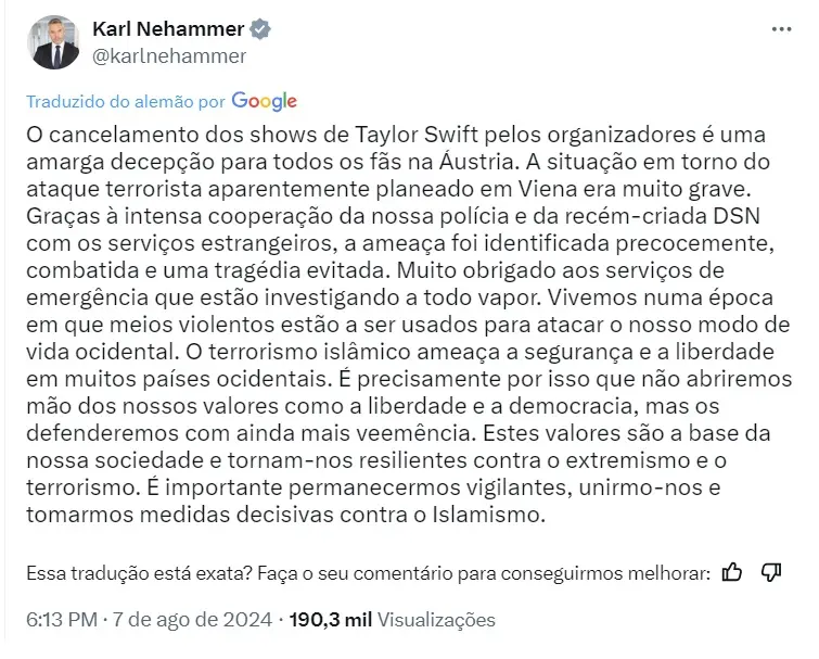Na rede social "X", o chanceler austríaco Karl Nehammer declarou que o cancelamento das apresentações foi uma "amarga decepção para todos os fãs".
