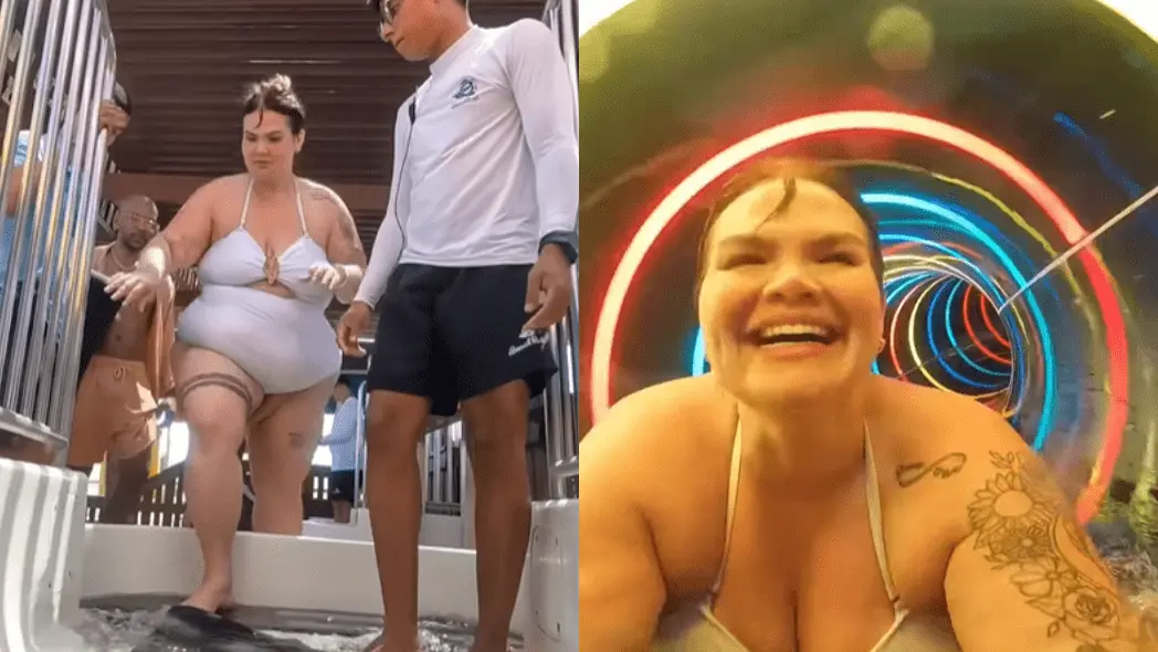 A influenciadora Thais Carla, 34, realizou na última sexta-feira (14) o sonho de descer em um toboágua durante viagem a um parque aquático, em Aquiraz, na Região Metropolitana de Fortaleza (CE). Isso acontece sete meses após a realização da cirurgia bariátrica.