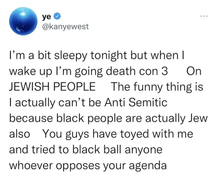 O rapper estadunidense Kanye West teve a conta do Twitter suspensa, neste domingo (9), após postagem antissemita. Na publicação, o artista dizia que era engraçado não poder “ser antissemita porque os negros são realmente judeus”. O tweet foi excluído.