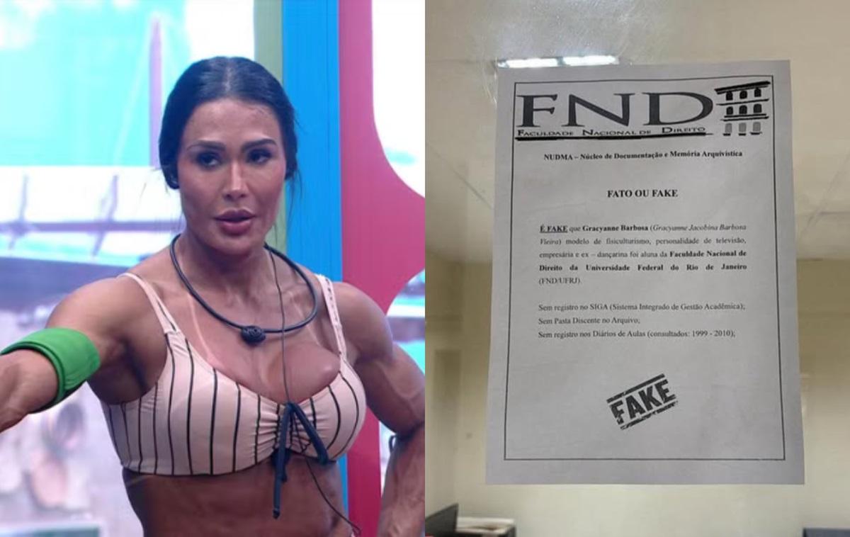 "É fake que Gracyane Barbosa, modelo de fisiculturismo, personalidade e televisão, empresária e ex-dançarina foi aluna da Faculdade Nacional de Direito da Universidade Federal do Rio de Janeiro (FND/UFRJ). Sem registro no SIGA (Sistema Integrado de Gestão Acadêmica)", diz o texto, intitulado Fato ou Fake