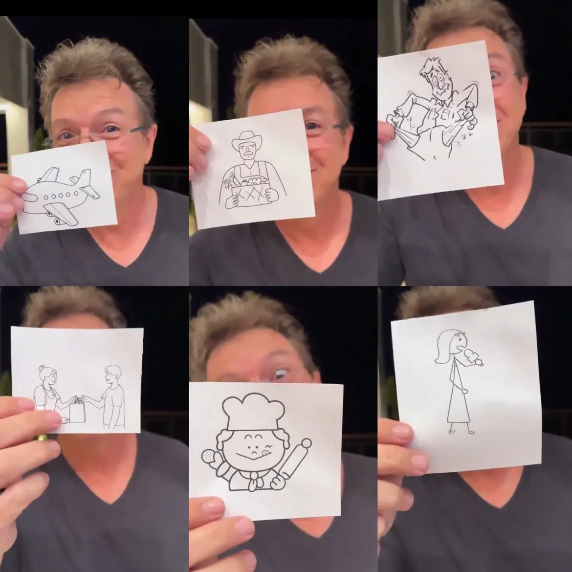 Legenda: Boninho divulgou ilustrações de um avião, um agricultor, um homem com os bolsos vazios, um padeiro, uma mulher com microfone na mão e um vendedor ou vendedora.