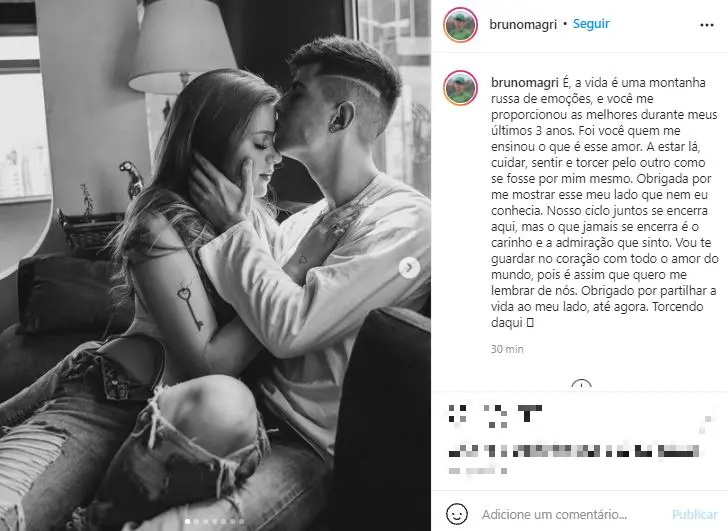 "Nosso ciclo junto se encerra aqui, mas o que jamais se encerra é o carinho e a admiração que sinto. Vou te guardar no coração com todo o amor do mundo, pois é assim que quero me lembrar de nós", escreveu ele.
