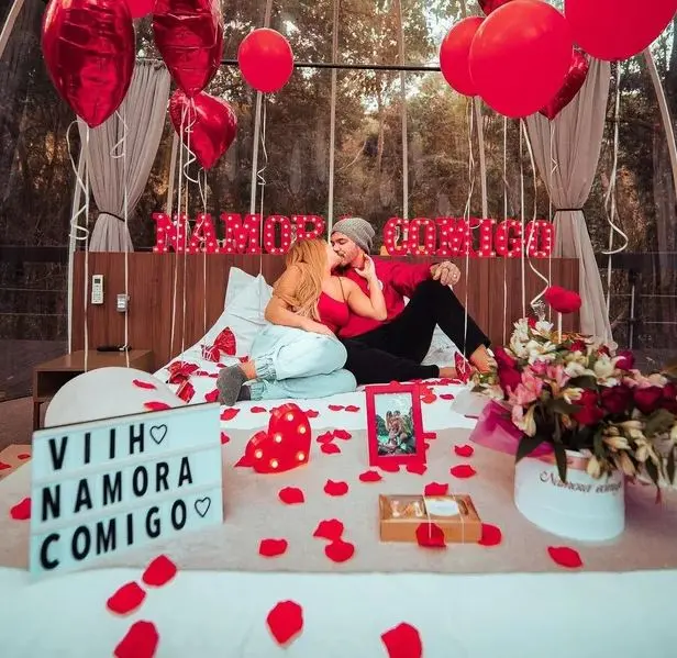 Eli preparou uma surpresa romântica em um hotel estilo cabana para a influenciadora, com direito a pétalas de rosas e balões personalizados com o pedido: "Viih, namora comigo?".