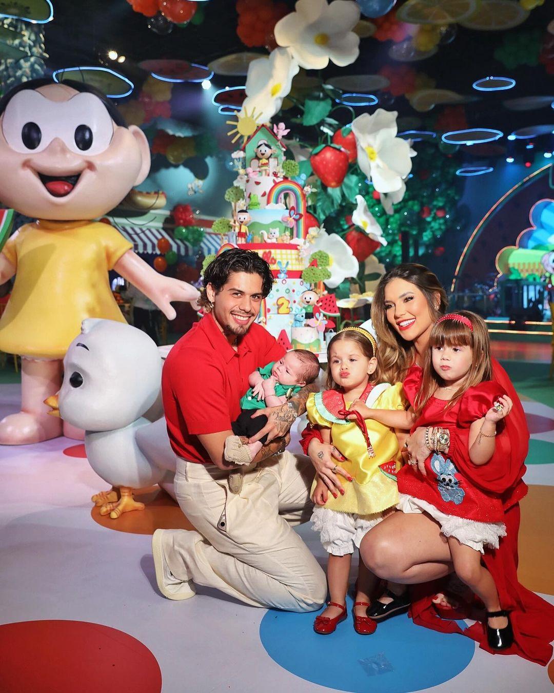 A roupa escolhida para Flor na festa usava a cor de Magali, amarelo, enquanto a da irmã dela, Maria Alice, fazia referência à cor da Mônica. Virginia e Zé Felipe posaram com as meninas e o caçula, José Leonardo, na entrada do evento.
