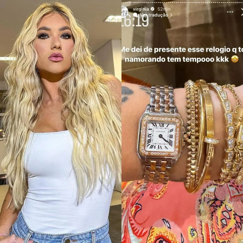 A influenciadora digital Virgínia Fonseca dividiu com os seguidores do Instagram, na segunda-feira (13), sua mais nova conquista: um relógio da grife de luxo Cartier, com quartzo, ouro rosa, aço e diamantes, avaliado no site oficial da marca em R$ 94 mil.