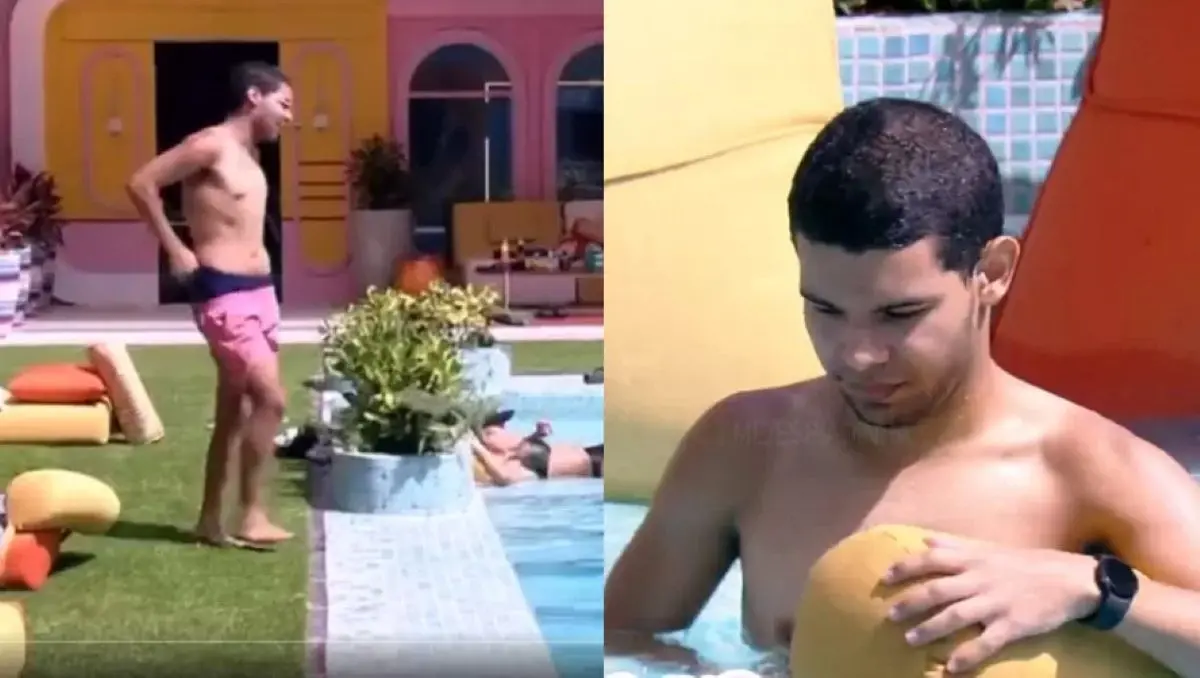 Ao entrar, o brother ficou só de sunga, nadou por alguns minutos, mas ficou tímido e colocou uma boia na frente do peito.