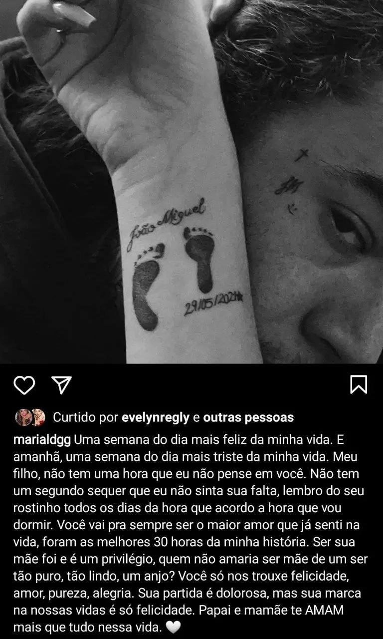 "Você vai pra sempre ser o maior amor que já senti na vida, foram as melhores 30 horas da minha história", afirmou. "Ser sua mãe foi e é um privilégio, quem não amaria ser mãe de um ser tão puro, tão lindo, um anjo? Você só nos trouxe felicidade, amor, pureza, alegria. Sua partida é dolorosa, mas sua marca na nossas vidas é só felicidade. Papai e mamãe te amam mais que tudo nessa vida".
