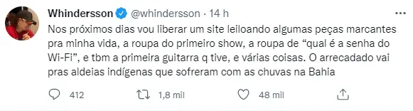 O humorista Whindersson Nunes anunciou, em publicação nas redes sociais no sábado (25), que irá colocar algumas das peças marcantes da carreira como artista para leilão. O objetivo, informou o artista, será doar a quantia arrecadada para as aldeias indígenas atingidas pelas chuvas na Bahia nos últimos dias.