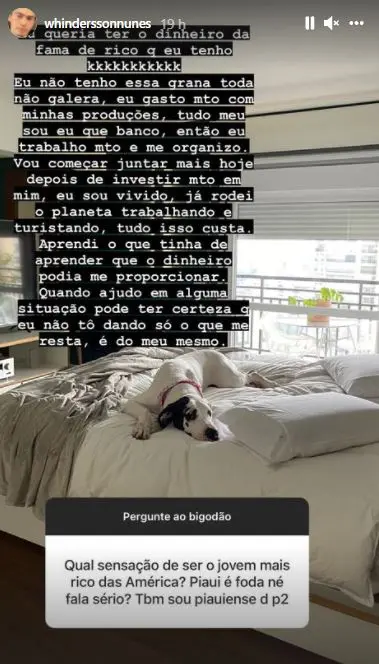 Respondendo a perguntas e respostas dos fãs, Whindersson falou sobre o patrimônio que possui, contrariando a ideia geral dos que acreditam em muita riqueza na vida do piauiense.
