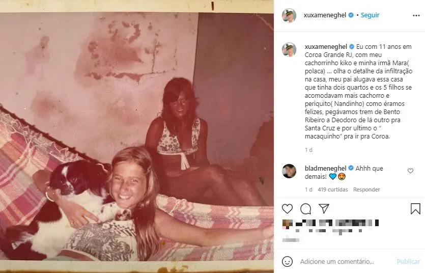 Xuxa aproveitou para mostrar momentos íntimos ao lado da família, deixando mensagem de saudade. Em um dos cliques, ela aparece aos 11 anos em Coroa Grande, no Rio de Janeiro, ao lado da irmã Mara e do cachorro Kiko.