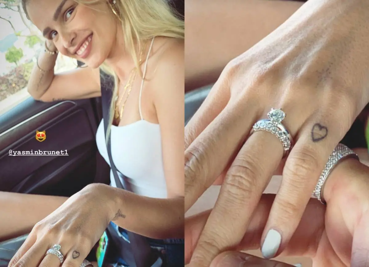 A aliança de casamento de Yasmin Brunet e Gabriel Medina foi vista pela primeira vez nesta segunda (8), após publicação feita pelo surfista nas redes sociais. A foto, tirada dentro do carro do casal, mostra o objeto cravejado de brilhantes e com uma pedra maior.