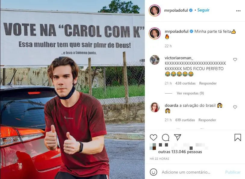 "Eu me mudei na cidade nova aqui e tinha um outdoor para comprar e eu comprei", afirmou nos stories do Instagram. O painel tem a mensagem: "Vote na 'Carol com K'. Essa mulher tem que sair plmr de Deus! E leva a Lumena junto". "Sinto que fiz um bem para a sanidade do nosso povo", escreveu o youtuber em outro post.
