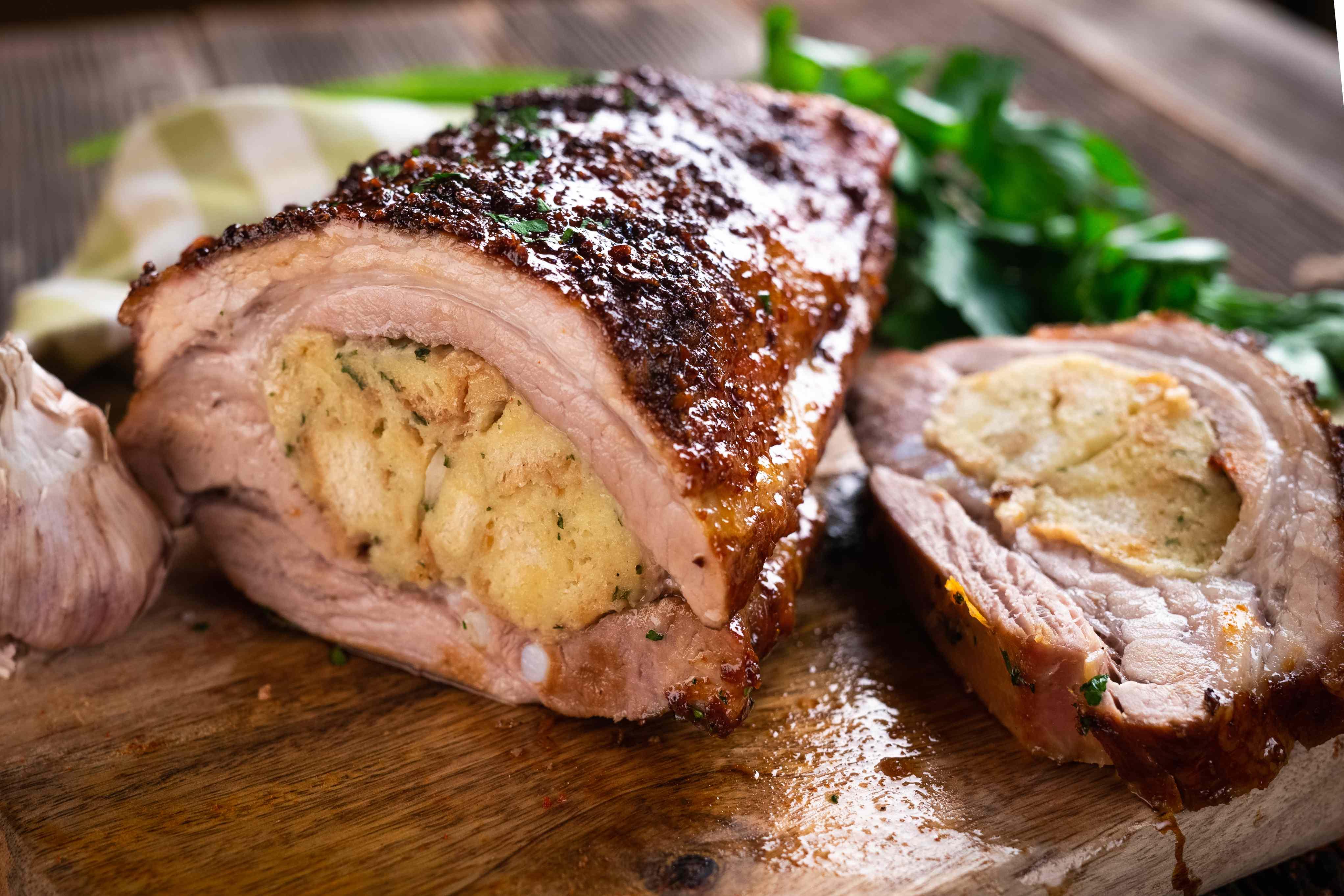 O bife de porco recheado é preparado com linguiça, pimentão, cebola e bacon. A receita pode ser acompanhada com arroz e legumes, servindo como prato principal do almoço ou jantar.