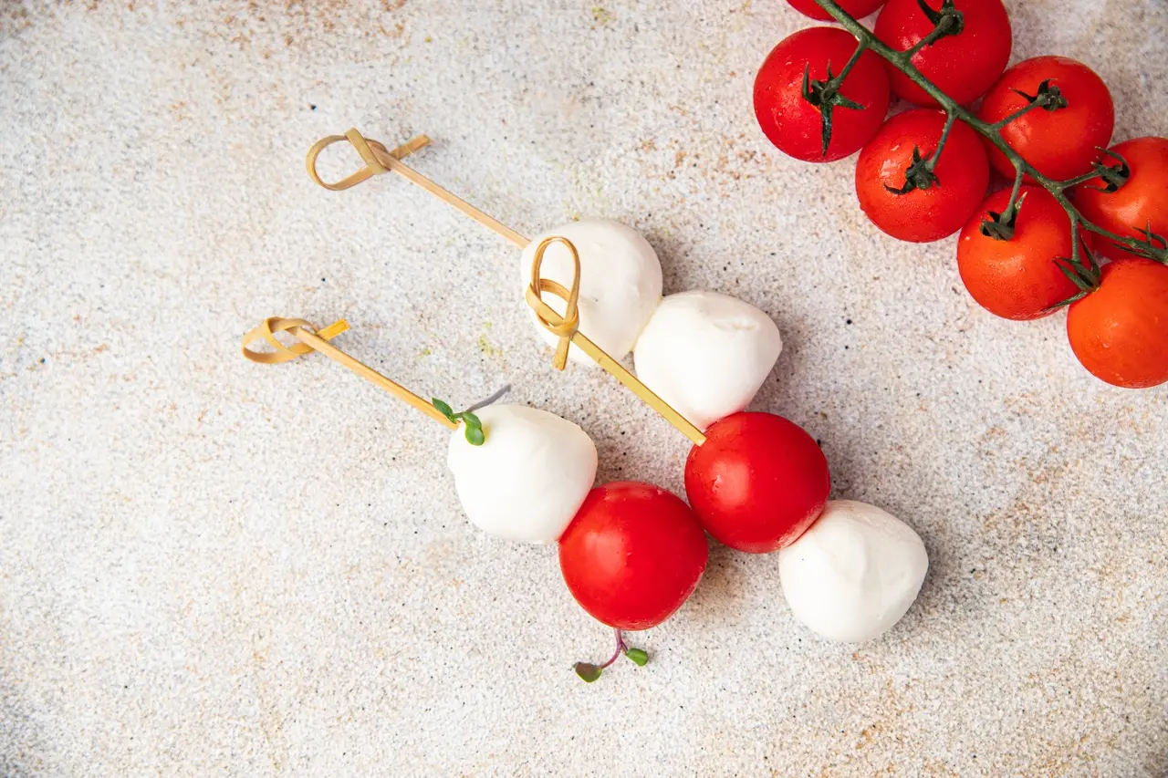 - Em palitos, espete o tomate-cereja, o manjericão e a mozarela de búfala. Dessa forma, o aperitivo já está pronto para ser servido.