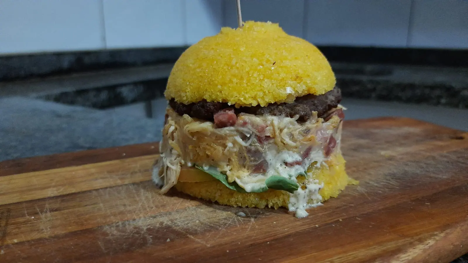 No lugar do tradicional pão, duas camadas generosas de cuscuz, recheadas com um hambúrguer caseiro que pode ter como acompanhamentos requeijão, diferentes molhos, queijo, carne de sol, calabresa, bacon, ovo ou frango desfiado. Tudo depende do gosto do freguês.