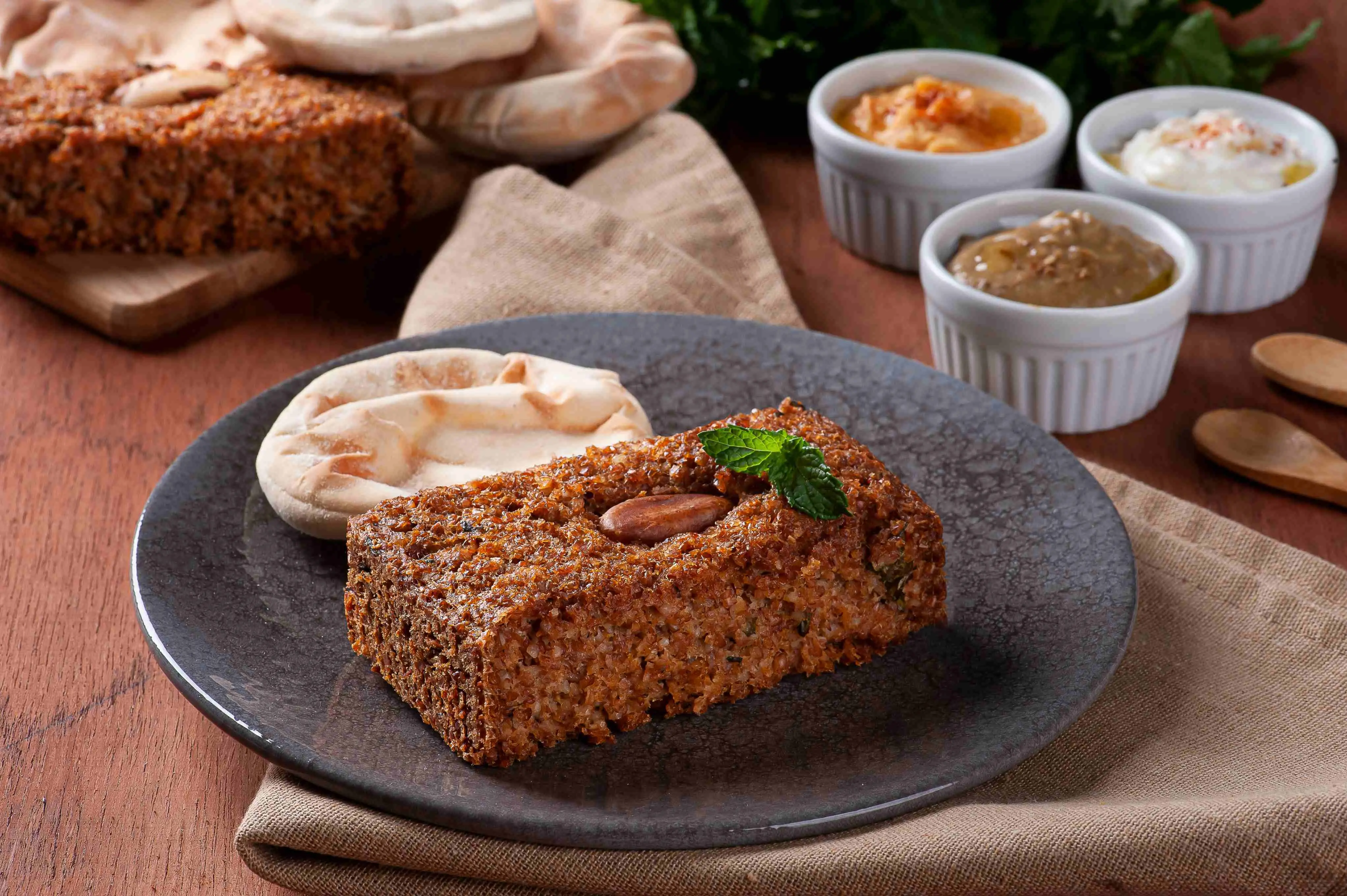 Para o quibe: umedeça o trigo com o caldo de legumes fervendo e espere esfriar. Tempere com as raspas de limão, as ervas picadas e 3g de pimenta dedo-de-moça picada. Acerte o sal e a pimenta do reino. Bata no processador a berinjela com o trigo até formar uma massa homogênea.