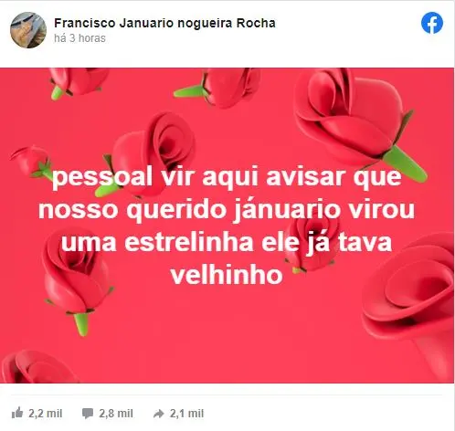 Na publicação, Carlos explicou o motivo pelo qual o animal morreu. "Pessoal, vim aqui avisar que nosso querido Januário virou uma estrelinha. Ele já tava velhinho", explicou. Januário morreu na última sexta-feira (29).