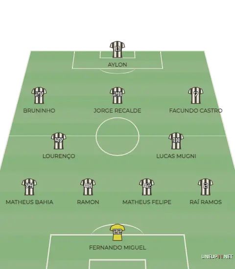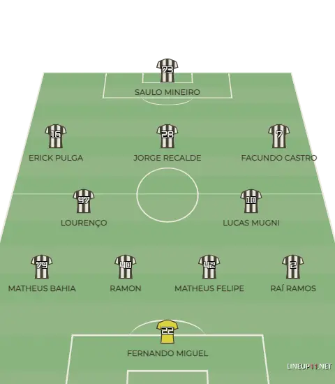 O time que entreou em campo tinha a 1º linha de quatro formada por Raí Ramos, Ramon, Matheus Felipe e Matheus Bahia, Lourenço e Mugni como volantes, Jorge Recalde como armador, além de Erick Pulga aberto da esquerda, Facundo Castro aberto pela direita e Saulo como centroavante na referência.