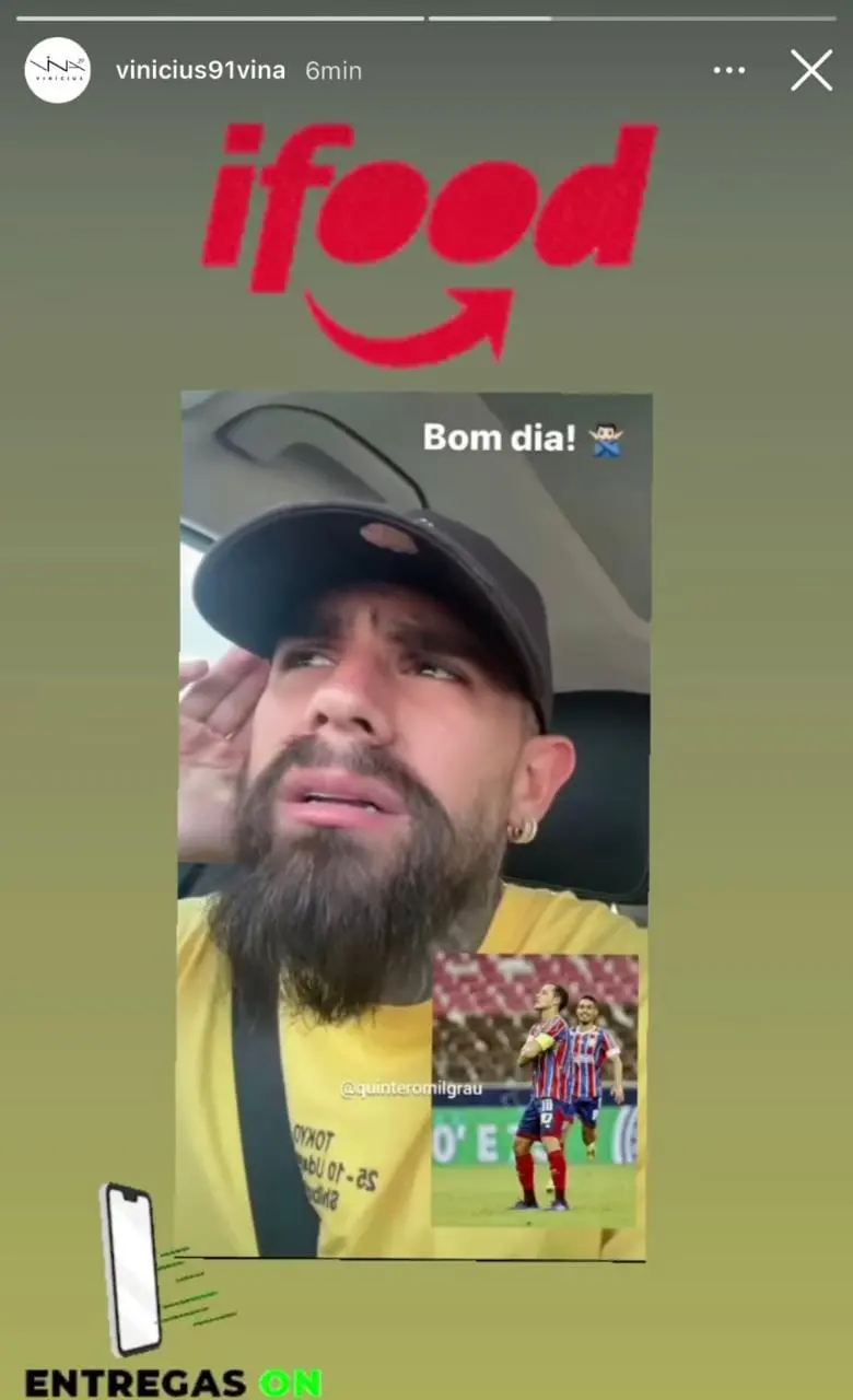 "Zagueiro gringo meia boca. A gente se vê em breve, parça! Nota 10 no ifood. Entregador!", disse em postagem no stories, do Instagram.